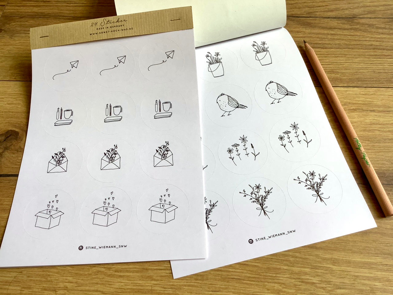 Im Set enthalten sind zwei DIN A5-Bögen mit jeweils 3×4 unterschiedlichen Motiven (siehe Produktfotos), also insgesamt 24 Sticker.