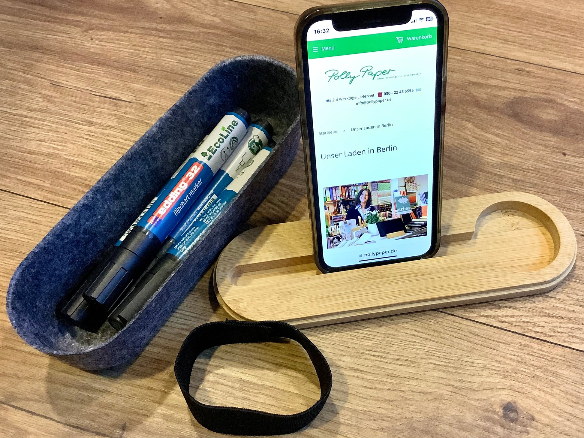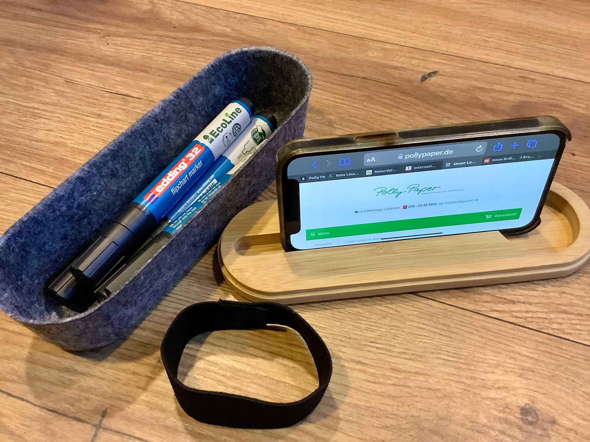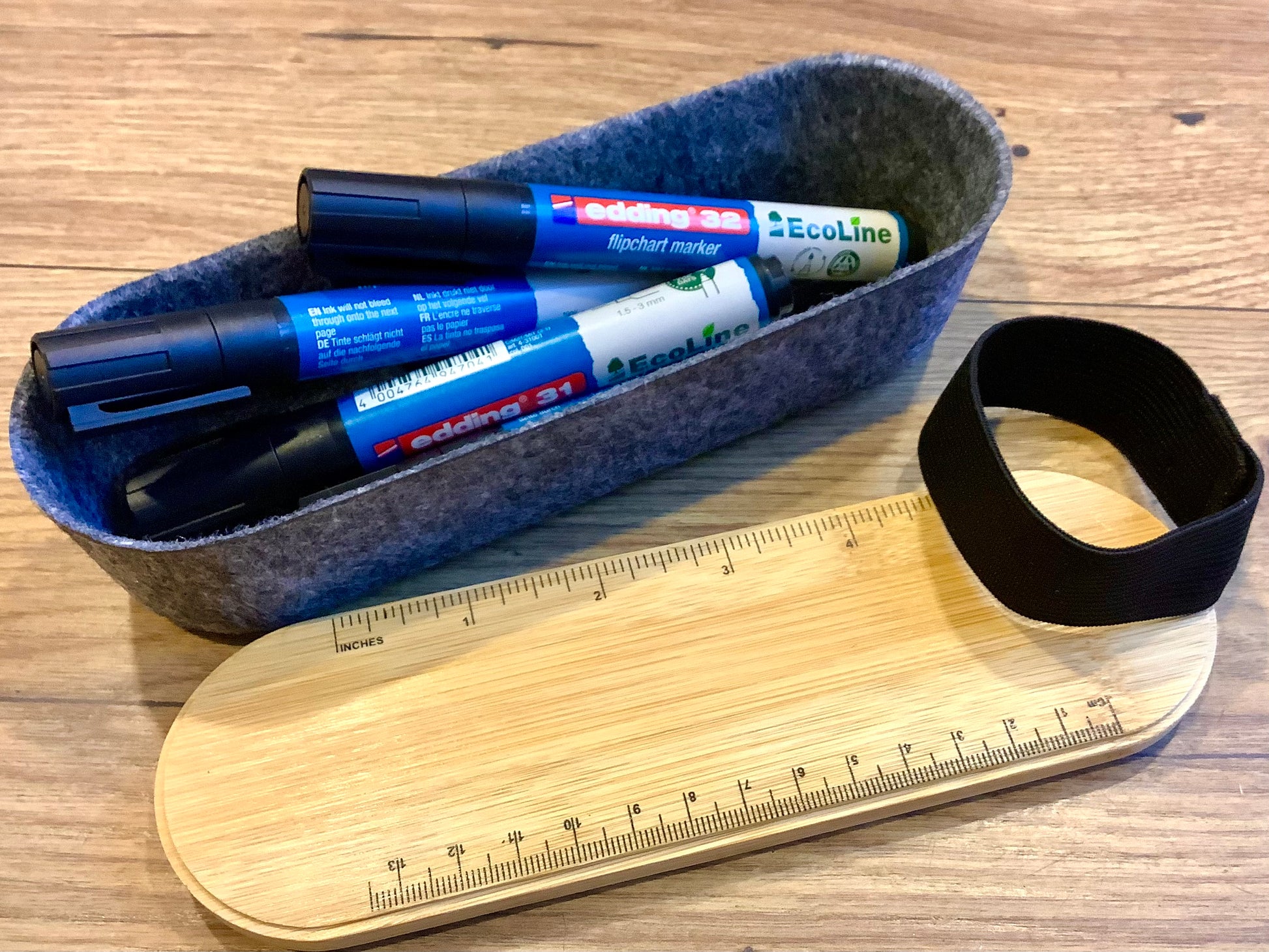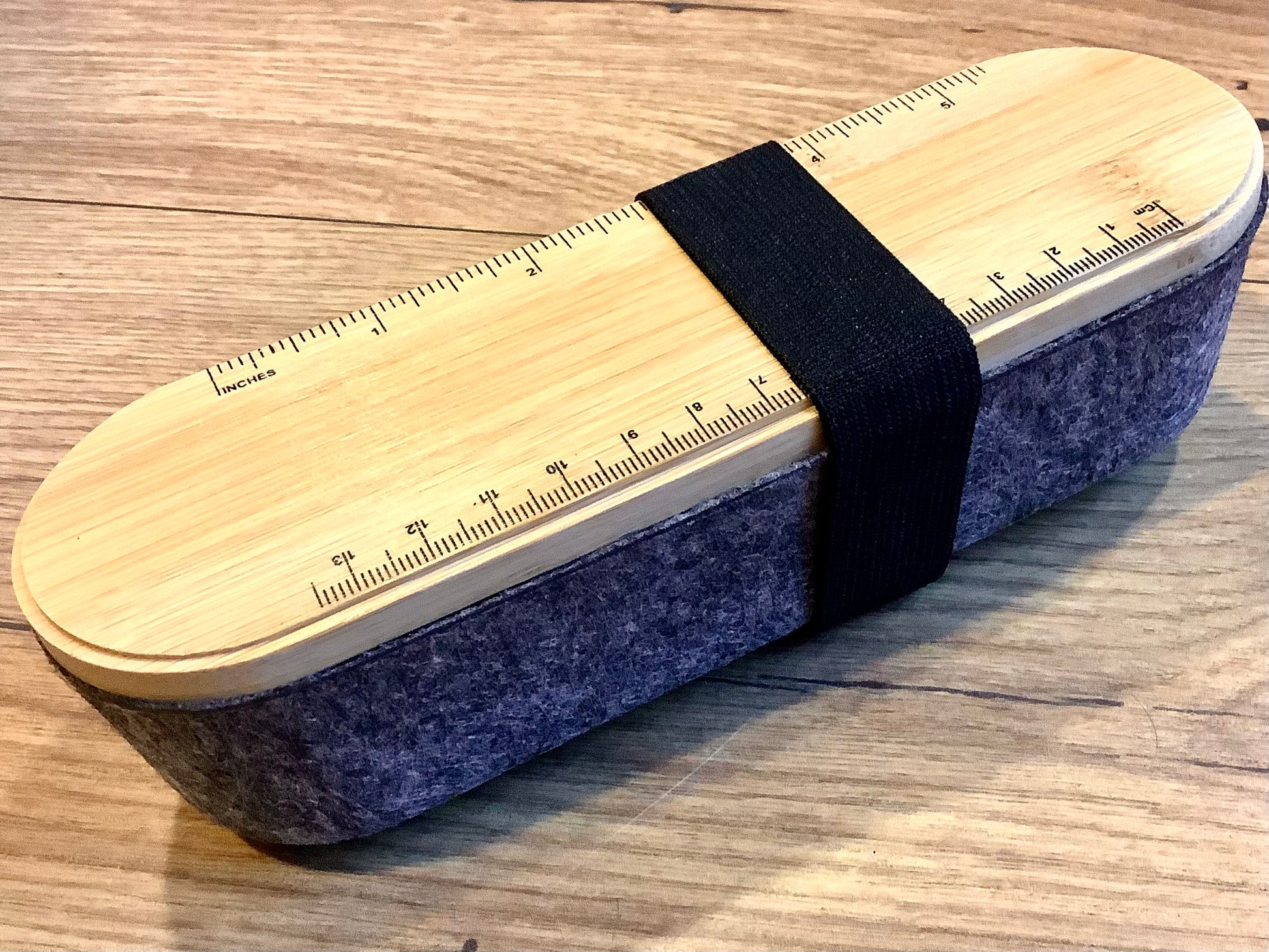 Mit Lineal im Deckel, der Deckel dient auf dem Schreibtisch außerdem als Handy-Halter