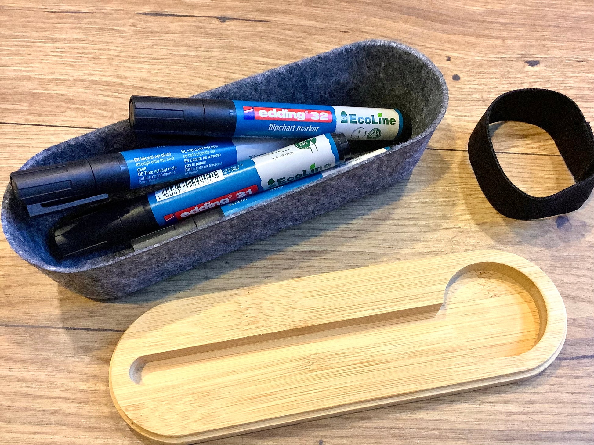 Praktische Stiftebox aus Pappe und recyceltem PET-Filz mit Deckel aus Bambusholz.