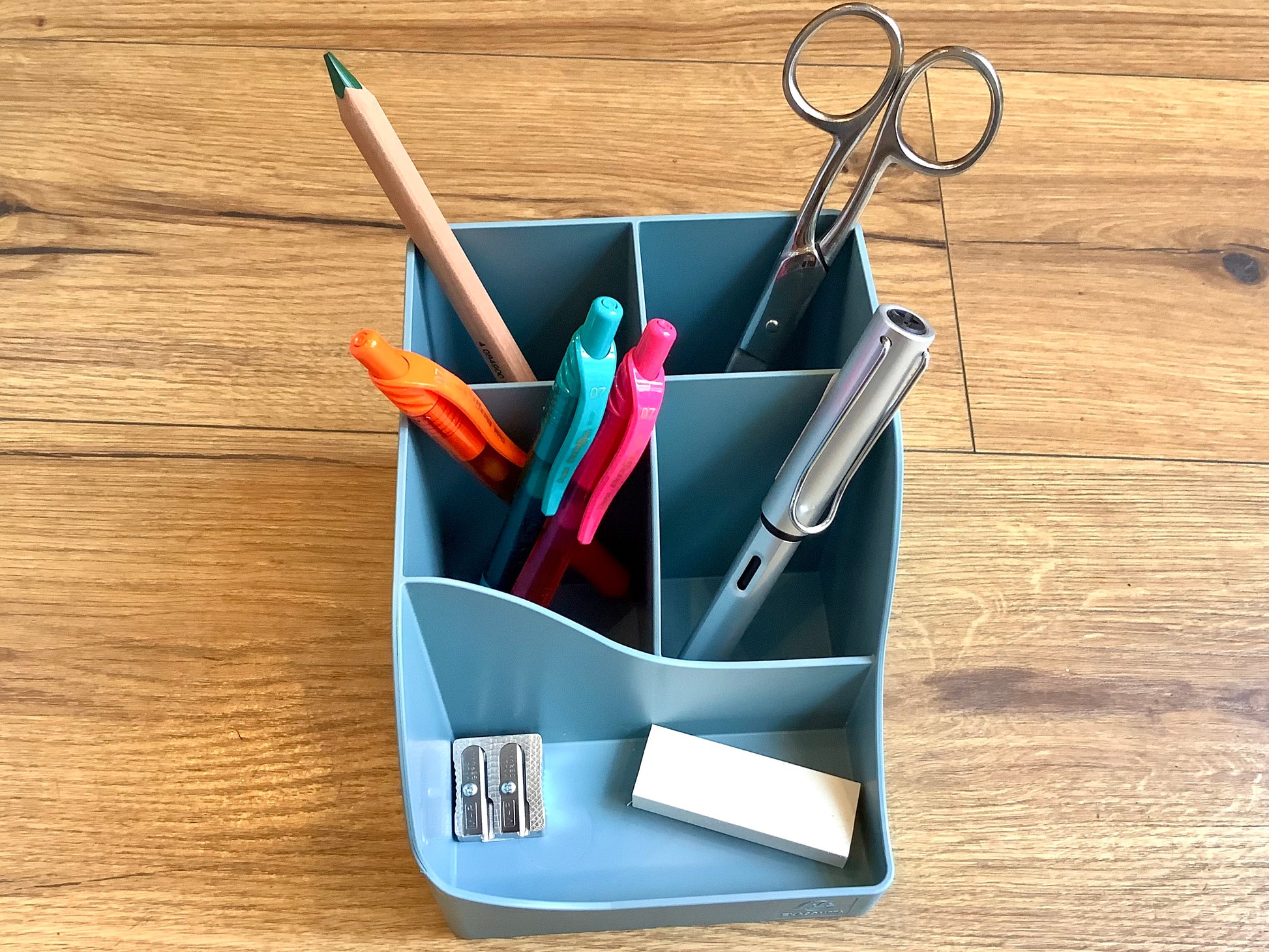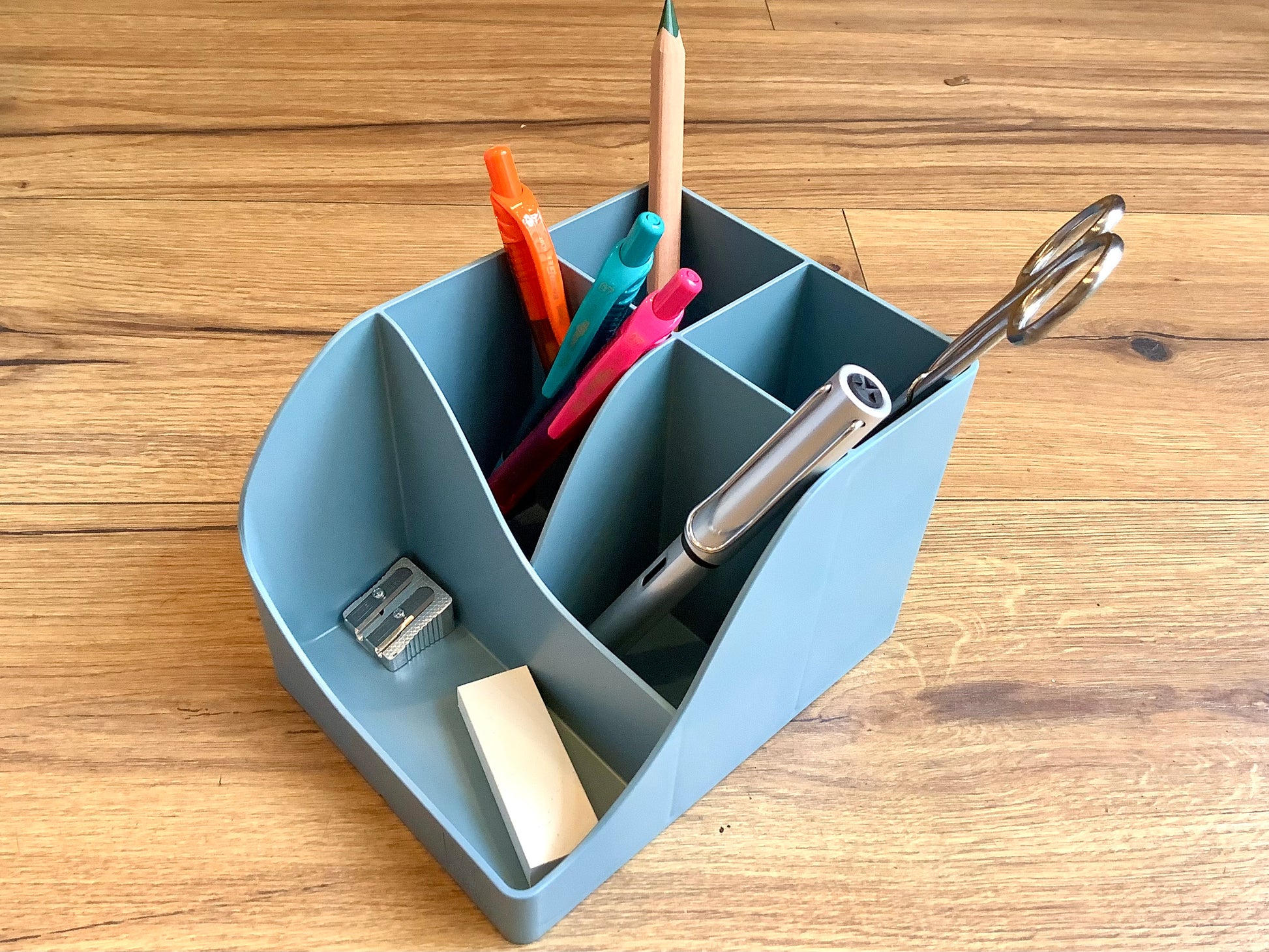 Mit seinen 5 unterschiedlich hohen Fächern bietet er viel Stauraum: 4 hohe Fächer für große Utensilien, Scheren, Stifte und 1 niedriges Fach für Gegenstände wie Büroklammern, Radierer, Anspitzer, USB-Sticks oder für ein Mobiltelefon.