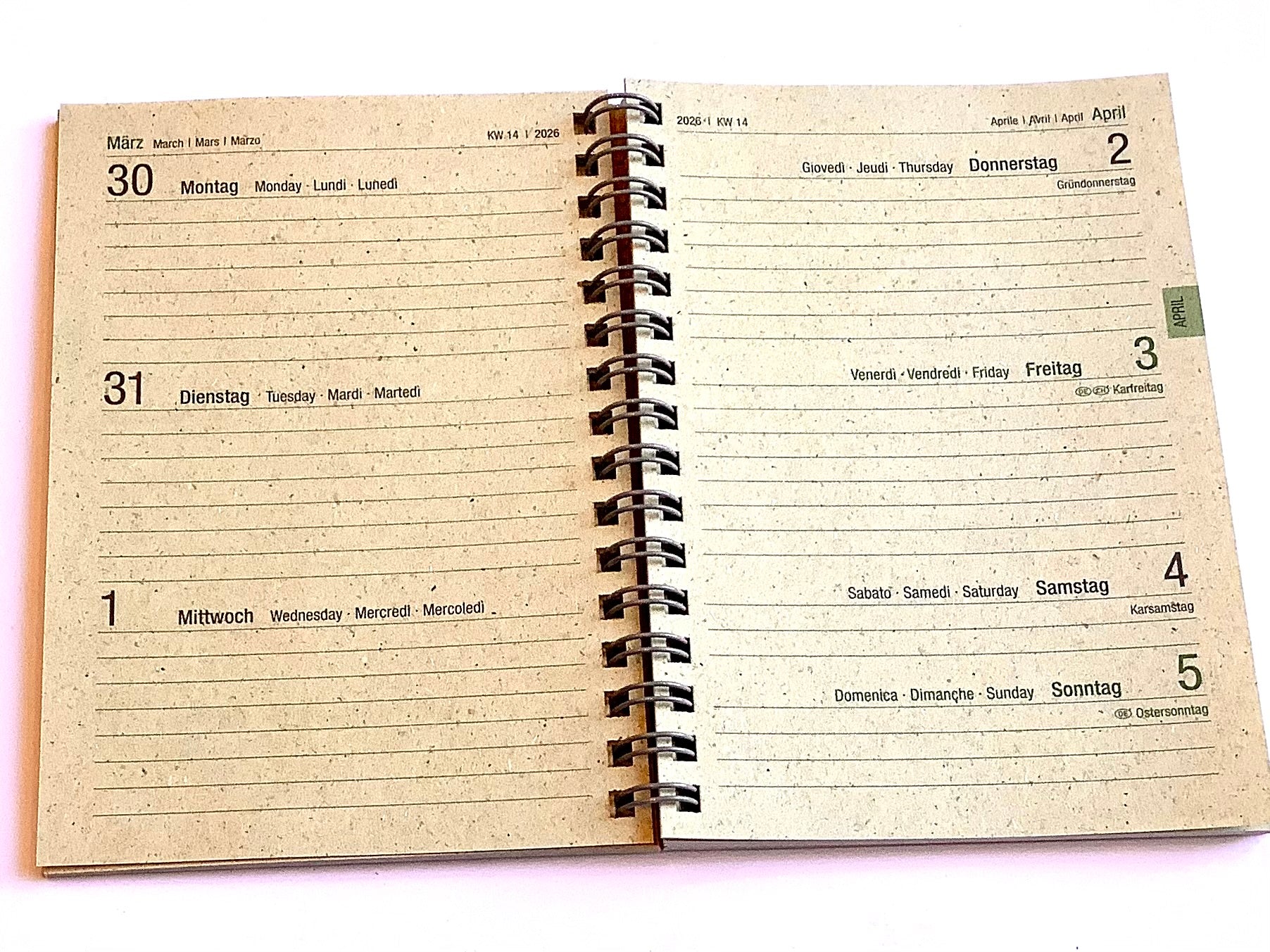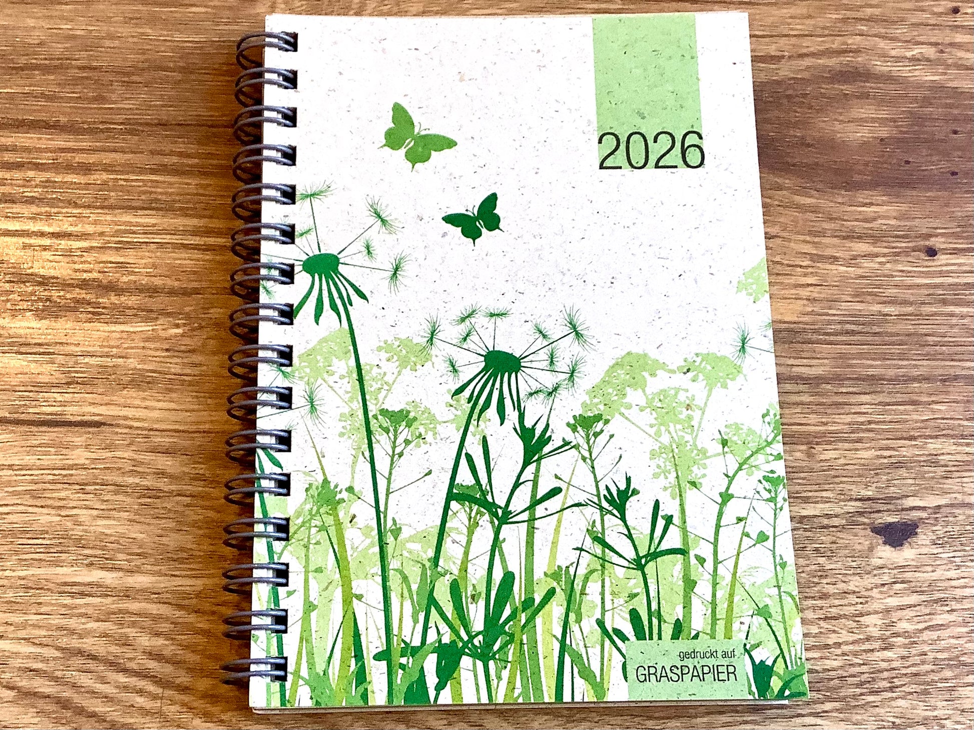 spiralgebundener A6-Taschenkalender für 2026 aus duftendem Graspapier mit einer Eine Woche auf einer Doppelseite.