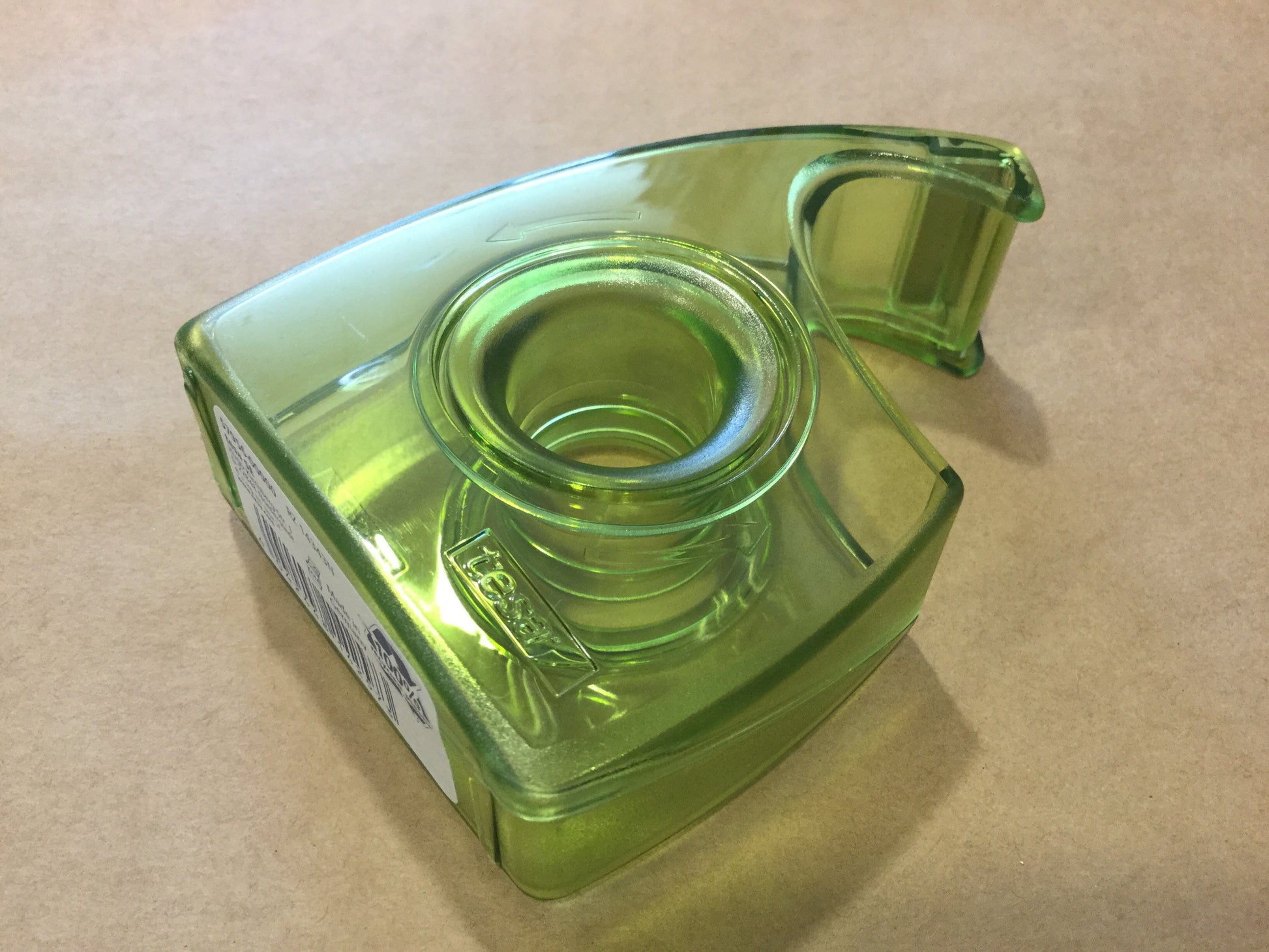 Der transparent-grüne Handabroller von tesa ecoLOGO ist umweltfreundlich, da er zu 100 % aus recyceltem Plastik besteht.