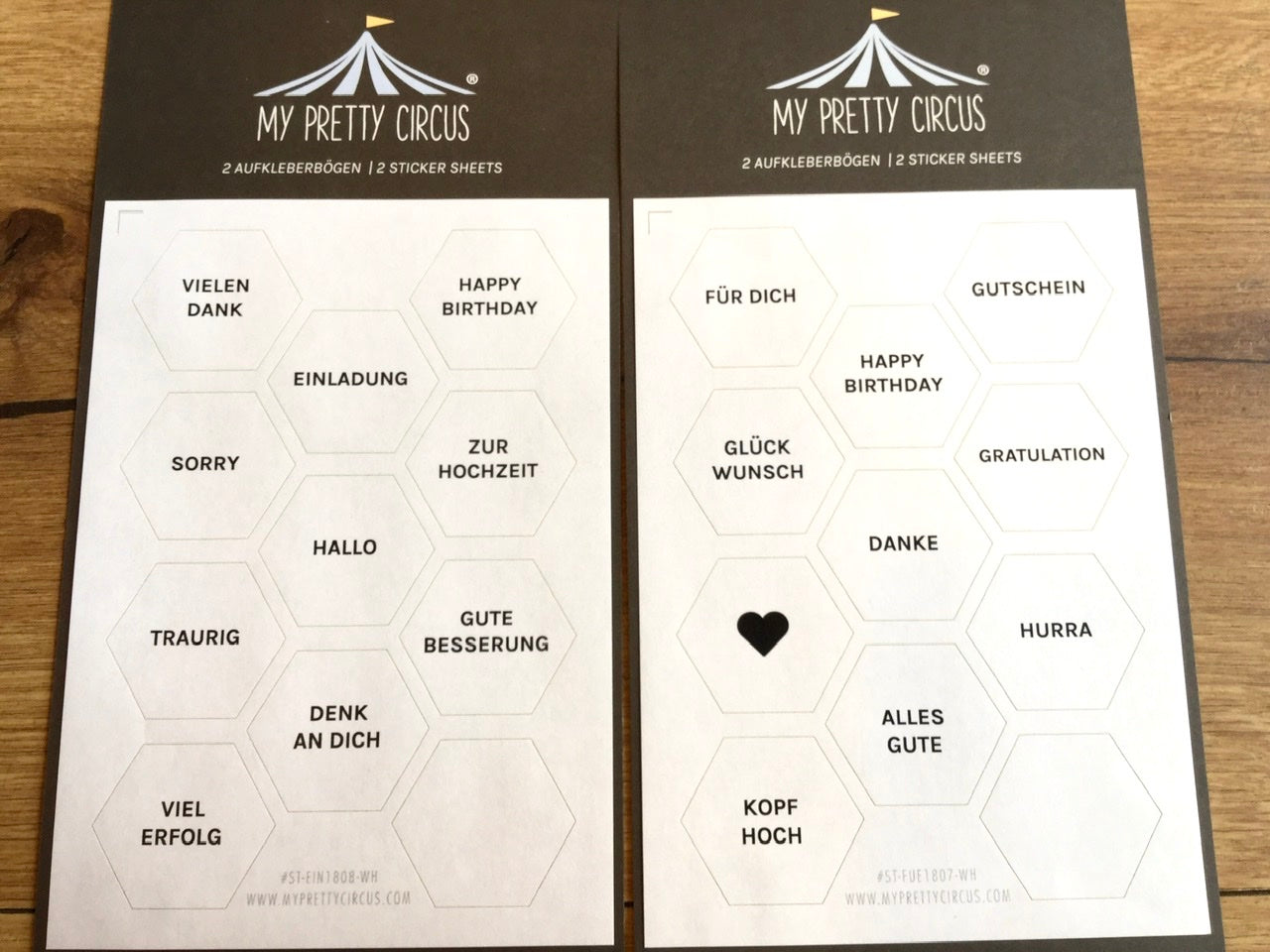 Die Sticker lassen sich perfekt mit einfarbigen oder schlichten grafischen Karten kombinieren. Einfach Anlass aussuchen, aufkleben, fertig. Auch auf Geschenkboxen, Tüten oder in Bullet Journals lassen sie sich gut kleben.
