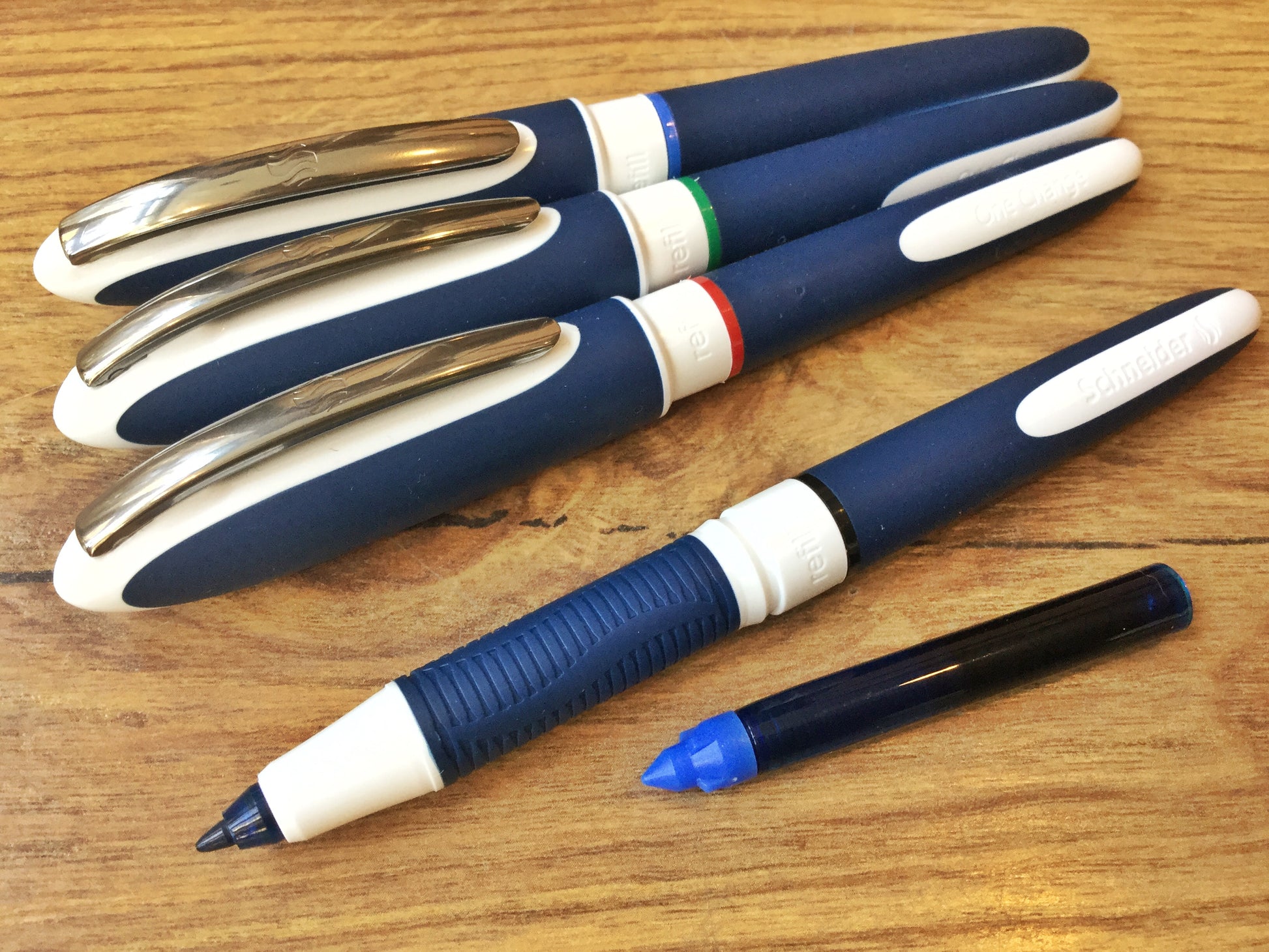 Der "One Change" von Schneider ist ein angenehm weich gleitender Tintenroller, in dem 2 austauschbare Patronen mit dokumentenechter Tinte stecken. Details: