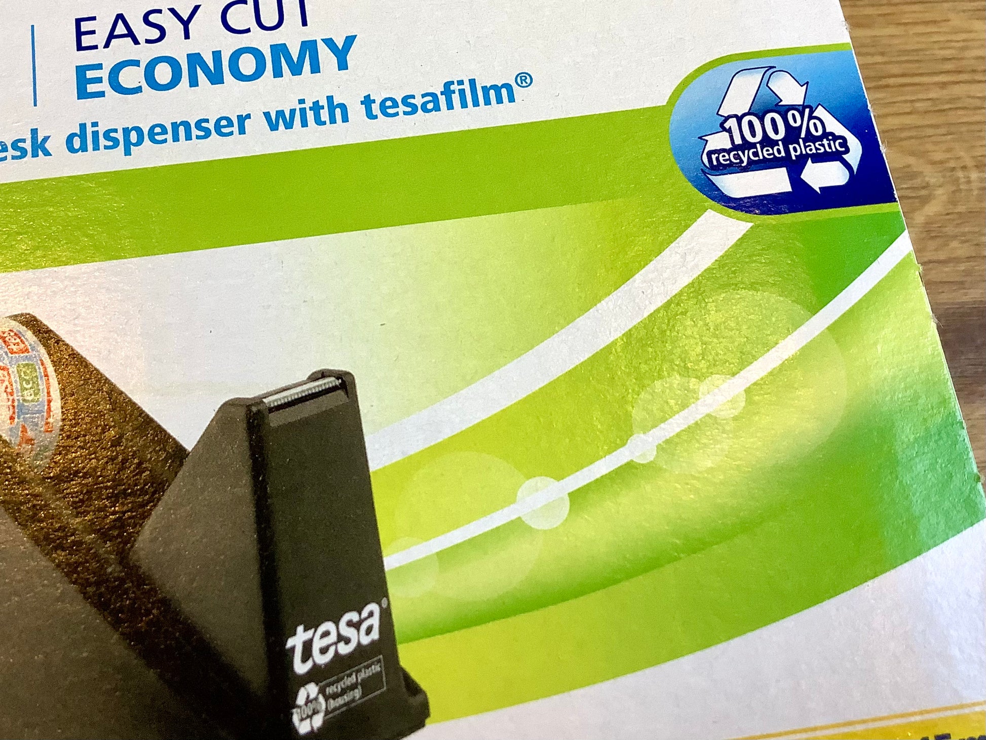 Schwerer Tischabroller von tesa aus 100 % Recyclingkunststoff.