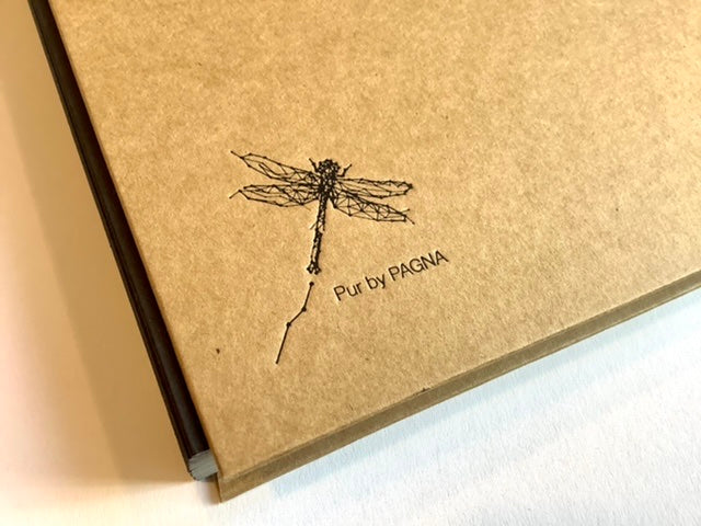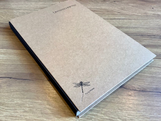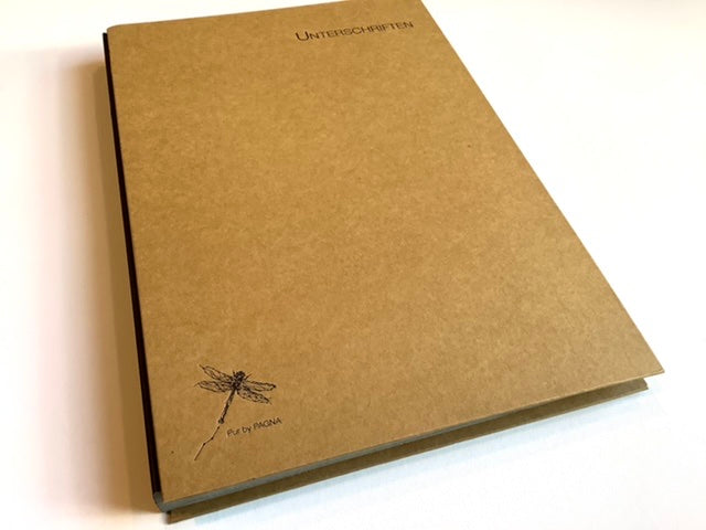 - Einband aus stabilem Graukarton (recycelt), mit naturbraunem Kraftpapier überzogen