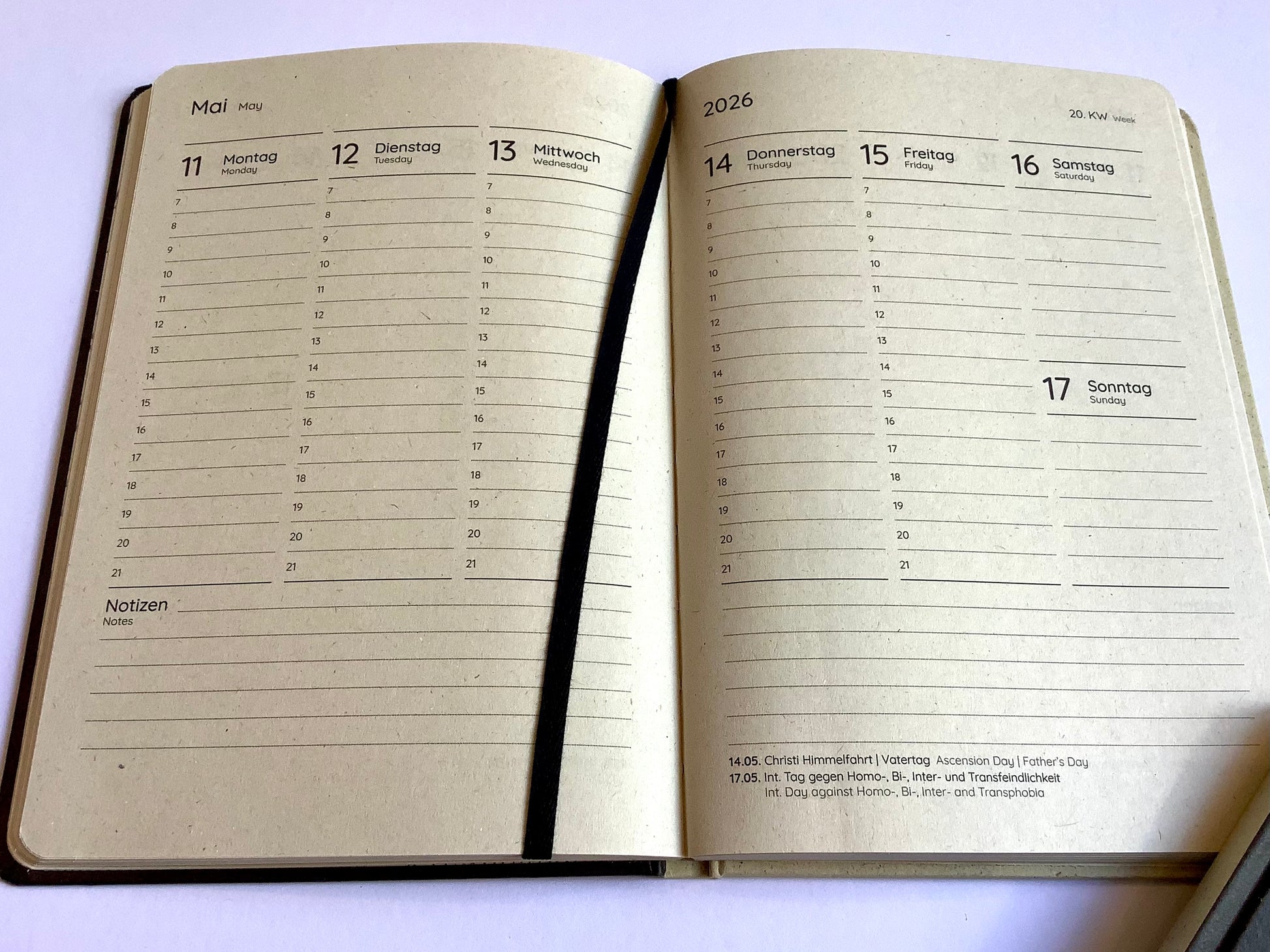 Veganes Kalenderbuch aus Graspapier von matabooks - die ersten V-Label-zertifizierten Bücher Deutschlands.