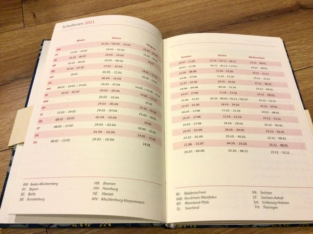 - eine Woche auf einer Seite, die rechte Seite liniert für Notizen