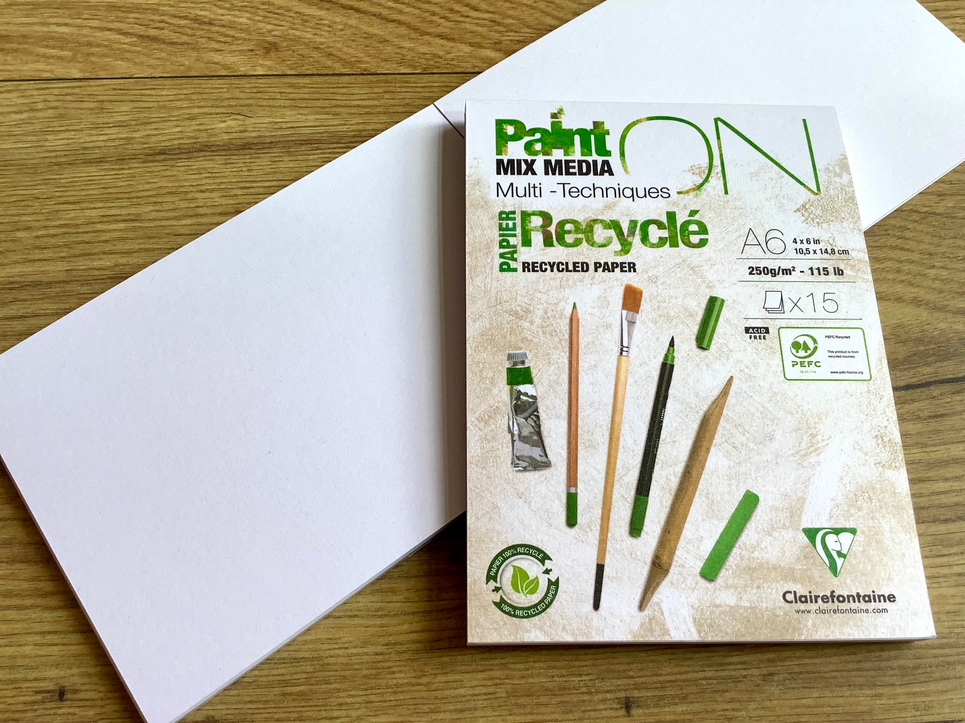 Kleiner Malblock für unterwegs: "PaintOn" von Clairefontaine mit 15 Blatt starkem weißen Zeichenpapier in DIN A6 (ca. 10 x 15 cm).