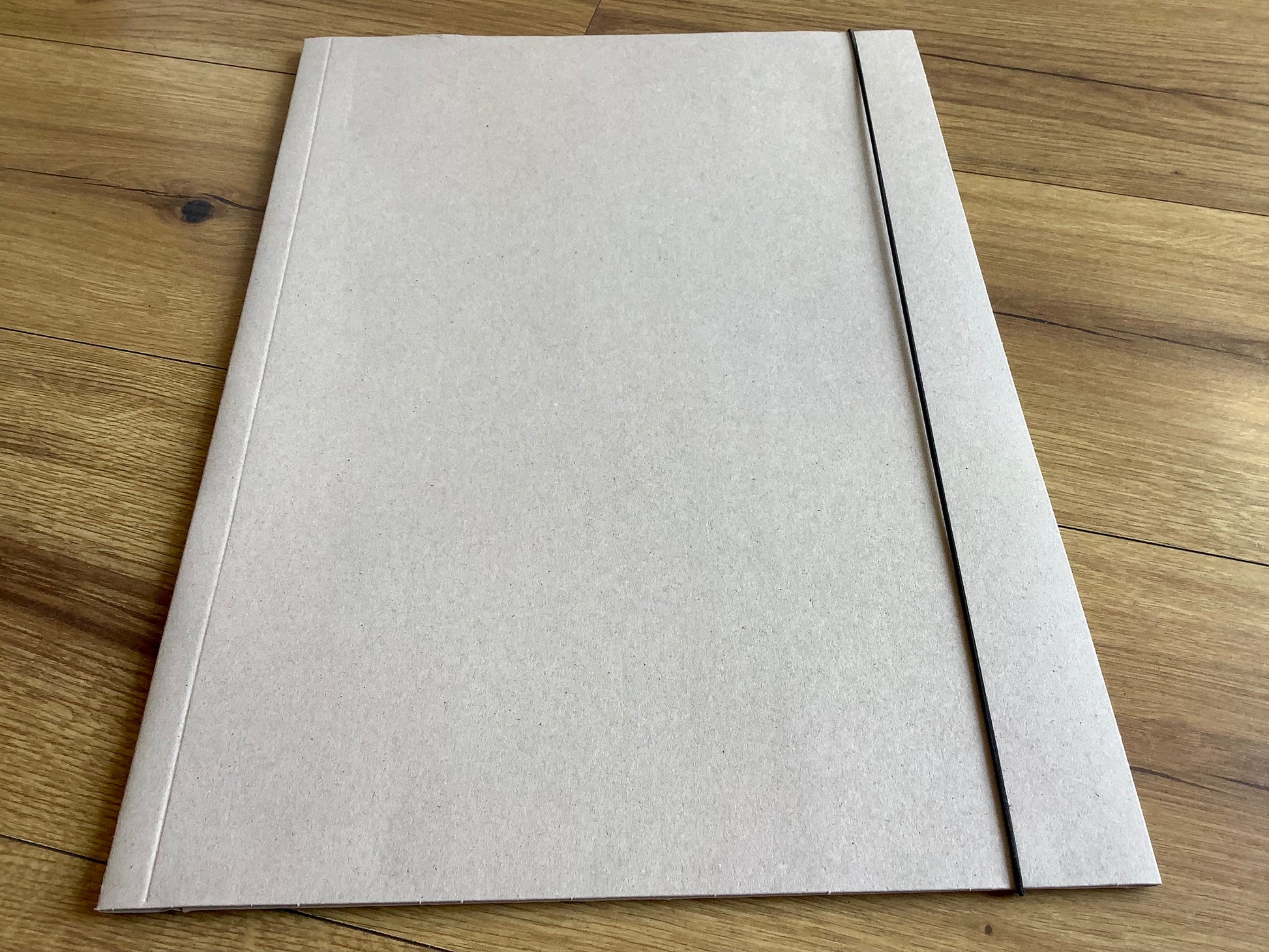 Zeichenmappe / Sammelmappe aus Graukarton (Recycling) mit schwarzem Verschlussgummi für DIN A3-Papiere und Bilder.