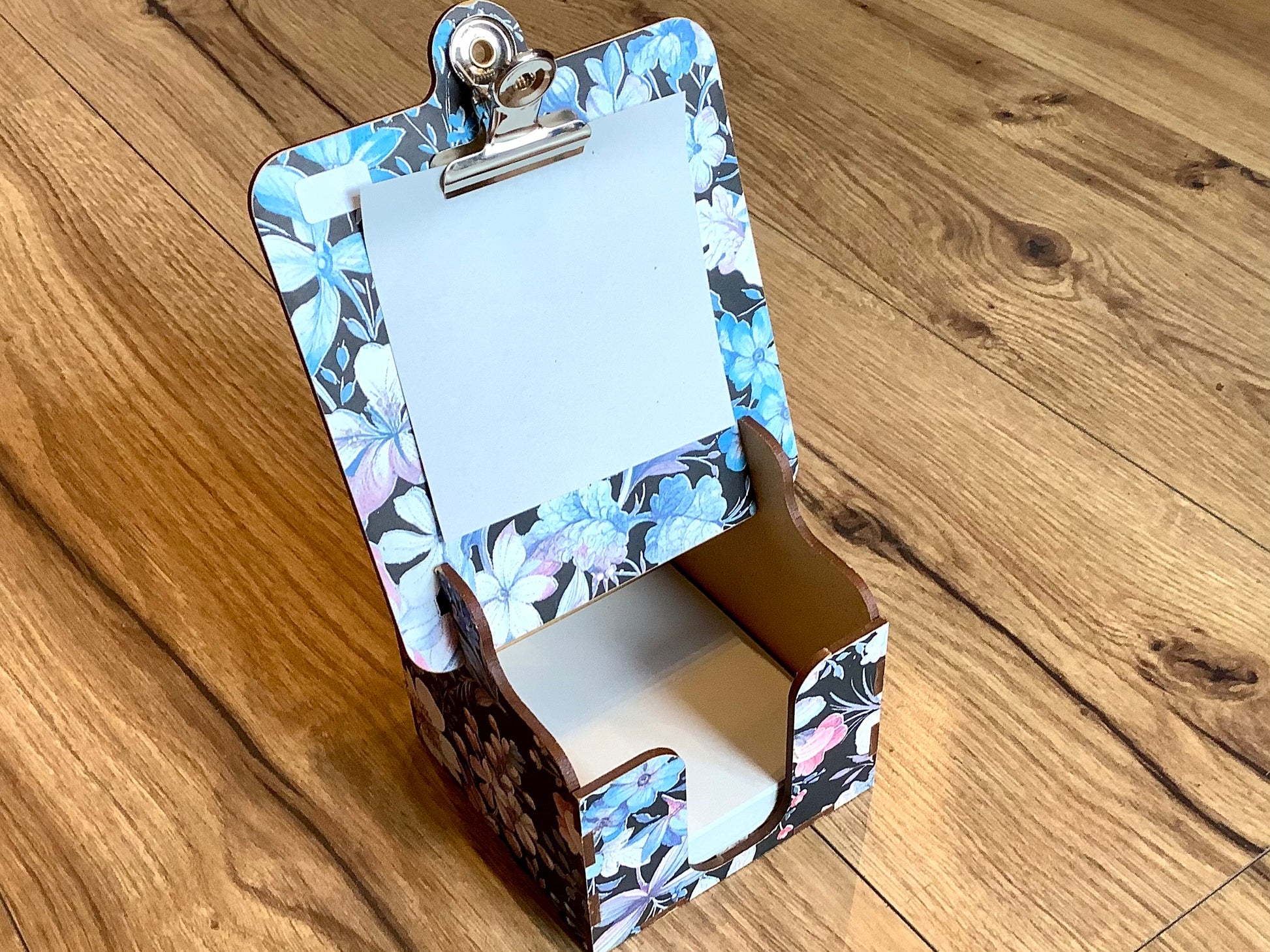 Eine praktische Kombi fürs Büro oder für zu Hause: Zettelbox mit kleinem Klemmbrett, auf das du eine Notiz klemmen kannst.