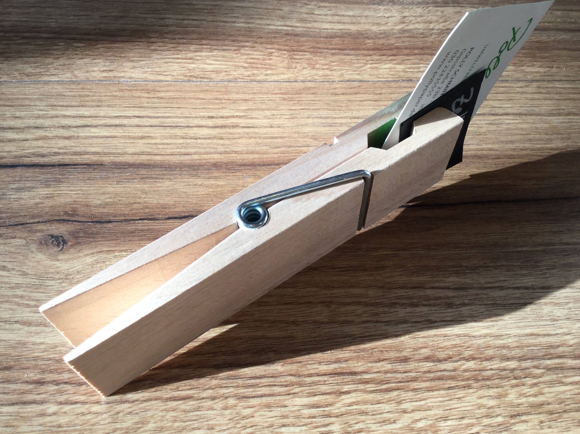 Diese große Zettelzange aus massivem Buchenholz ist ein echter Hingucker. Sieht aus wie eine Riesenwäscheklammer. Mit stabiler Stahlfeder für festen Halt eignet sie sich gut zum Halten von Notizzetteln.
